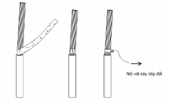 b) Màng chắn kim loại của cáp được nối đất thông qua sợi dây đồng trần nằm sát ngay bên dưới lớp màng kim loại. Sợi dây đồng này sẽ được bắt chặt bằng ê cu vào một con vít đã lắp sẵn bên trong tủ hoặc hộp cáp. Dây nối đất của tủ hoặc hộp cáp bằng đồng có tiết diện không nhỏ hơn 25 mm2, bố trí dọc cột dẫn xuống tổ tiếp đất và được bảo vệ bằng máng hoặc ống PVC.