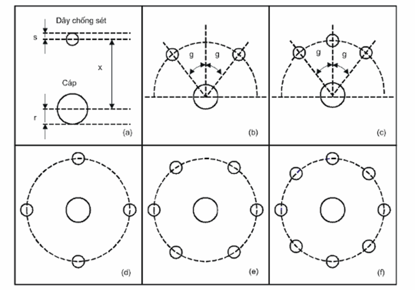 d) Tuỳ thuộc vào điện trở tiếp đất yêu cầu có thể dùng một hoặc nhiều điện cực tiếp đất. Điện cực tiếp đất được chôn ngay tại chân cột treo cáp. Nếu dùng nhiều điện cực tiếp đất thì nên bố trí dãy các điện cực tiếp đất vuông góc với hướng tuyến cáp. Hệ thống nối đất dây thép bện treo cáp được trình bày trên hình C.10.