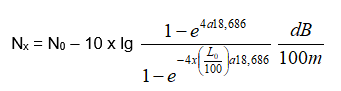 * Trong đó: a là suy hao truyền dẫn đo được trên độ dài cáp ‘L0’ tính bằng đơn vị dB; N0 là suy hao xuyên âm đầu gần đo được trên độ dài cáp ‘L0’ tính bằng dB; Nx là suy hao xuyên âm đầu gần quy đổi trên độ dài Lx = 100 m tính bằng dB; L0 là chiều dài đoạn cáp cần xác định xuyên âm đầu gần, tính bằng m: Lx là độ dài chuẩn (Lx = 100 m): e =2,71828.