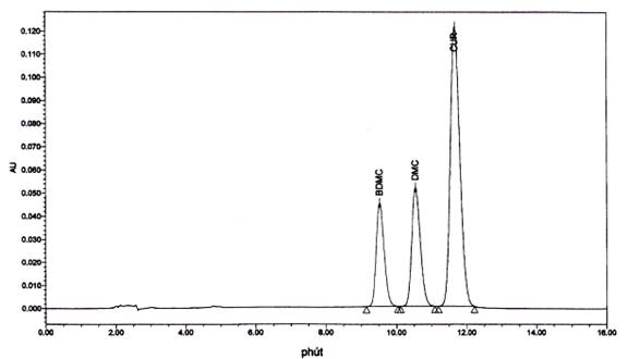 Bơm mẫu thử với cùng điều kiện như bơm chuẩn, xác định diện tích hoặc chiều cao pic. Dựa vào đường chuẩn của từng chất phân tích, xác định hàm lượng CUR, DMC và BDMC có trong mẫu thử.