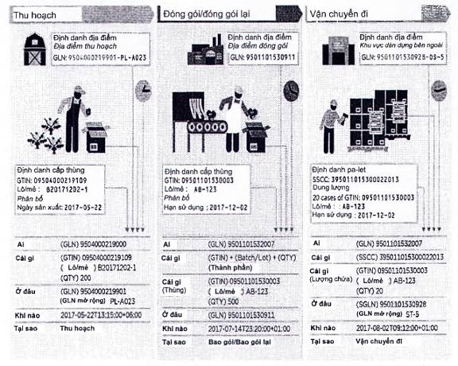 Các sự kiện vận chuyển xuất hiện khi sản phẩm có thể truy xuất nguồn gốc được vận chuyển giữa các đối tác thương mại. Sản phẩm này được sử dụng như một phần trong sự kiện vận chuyển tiếp theo bởi cơ sở sản xuất, kinh doanh tiếp nhận hoặc có thể là sản phẩm có thể truy xuất được cơ sở sản xuất, kinh doanh tiếp nhận vận chuyển đến một đối tác thương mại khác mà không chuyển đổi. Trong một số trường hợp, việc vận chuyển một sản phẩm có thể truy xuất giữa hai cơ sở chế biến hoặc bảo quản của cùng một cơ sở sản xuất, kinh doanh có thể được ghi nhận là một sự kiện vận chuyển. Thông thường, các sự kiện vận chuyển xuất hiện dưới dạng sự kiện vận tải, sau đó là sự kiện tiếp nhận hàng.