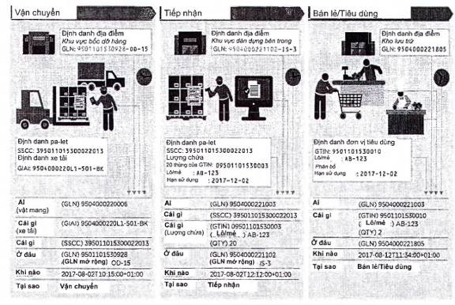 | Vận chuyển | GTIN + thông tin bổ sung (lô/mẻ) cũng như hồ sơ của cơ sở sản xuất, kinh doanh vận tải được sử dụng trong trường hợp thu hồi từ nguồn hoặc thu hồi do nhiễm bẩn vận chuyển | Người vận chuyển (GLN) | Thông báo xác nhận và thanh toán |