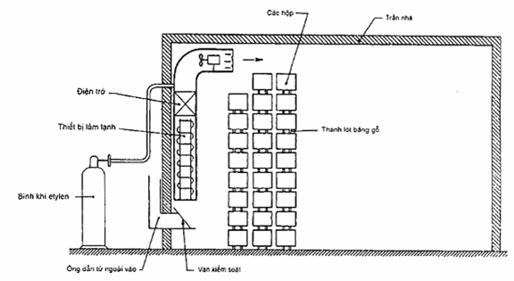 - Đối với quả mới được thu hoạch, việc dùng khí etylen ở mức 1/1000 trong không khí ở 200C có hiệu quả hơn so với việc sử dụng môi trường không khí giàu oxy cho dù nồng độ oxy đậm đặc.