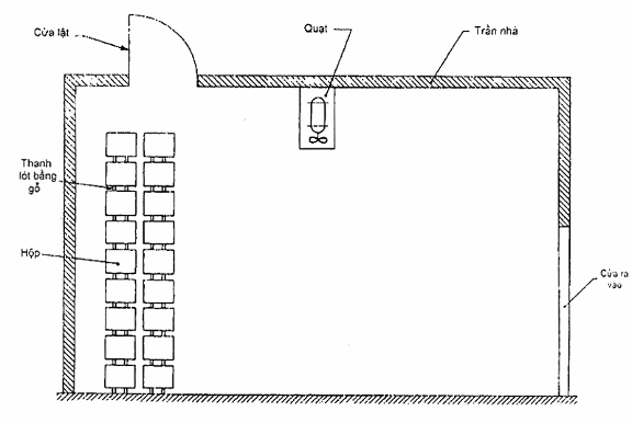 Hình 2 mô tả kiểu phòng làm chín sơ bộ có thể được xây dựng trong một nhà kho hoặc hầm2). Phòng này không có bộ phận làm lạnh hoặc bộ phận thay mới không khí. Phòng có cửa lật trên trần nhà. Không khí trong phòng được làm đồng đều bằng cách sử dụng quạt. Vào mùa đông, cần chuẩn bị thiết bị làm nóng (nước nóng, điện hoặc ga) để thu được nhiệt độ cần thiết (thông thường từ 150C đến 220C).