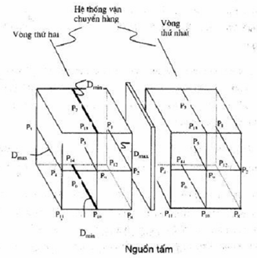Chú ý - Các thùng khối chữ nhật đi 2 vòng, mỗi vòng đi qua một bên nguồn gamma phẳng cố định. Vùng liều min và max sau vòng thứ hai biểu thị bằng đường gạch. Vị trí các liều kế theo khuyến cáo khi xác định đặc tính nguồn chiếu xạ được biểu thị bằng Ps.