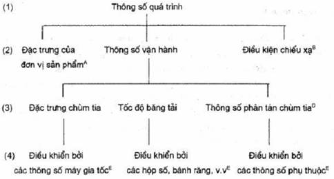 4.3. Có những thông số khác nhau đóng vai trò quan trọng trong việc xác định và kiểm soát liều hấp thụ trong quá trình xử lý chiếu xạ trên một thiết bị chiếu xạ cụ thể. Điều quan trọng là phải hiểu rõ mối quan hệ giữa các thông số đó. Hình 2 là biểu đồ mô tả các mối quan hệ đó. Các thông số vận hành (đặc trưng của chùm tia, tốc độ băng tải và các thông số phân tán của chùm tia) là những thông số có thể đo được và các giá trị của chúng phụ thuộc vào các thông số điều khiển quá trình (xem hình 2). Trong giai đoạn xác lập đặc trưng thiết bị, các đặc trưng về liều hấp thụ được xác lập nhờ sử dụng vật liệu đối chứng (dãy 3 hình 2). Còn các thông số quá trình (dãy 2 hình 2) để xử lý sản phẩm thực lại được thiết lập trong giai đoạn xác định chất lượng của sản phẩm nhằm đạt được liều hấp thu nằm trong giới hạn liều đã định. Trong quá trình xử lý sản phẩm, các thông số kiểm soát quá trình (dãy 4 hình 2) được giám sát và kiểm soát nhằm duy trì các giá trị của tất cả các thông số vận hành đã được cài đặt trong giai đọan xác định chất lượng sản phẩm.
