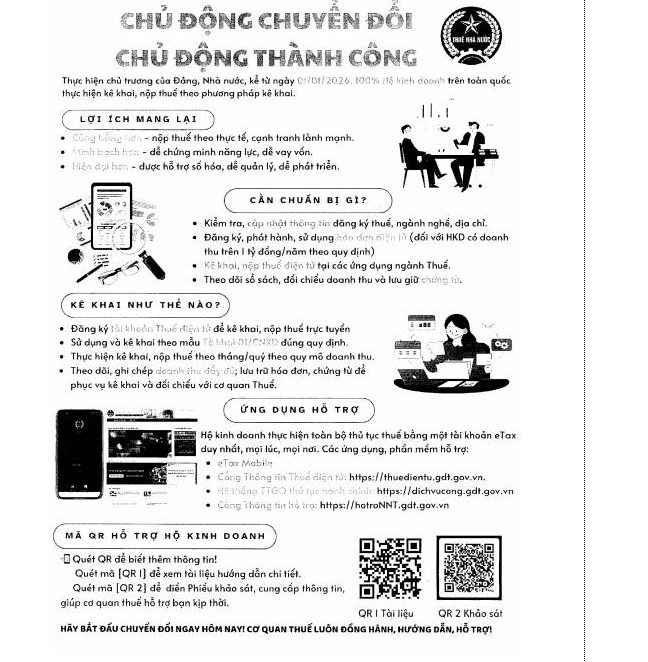 + Đối với các hộ kinh doanh Nhóm 2 nêu trên, có khả năng tiếp cận tốt hơn với các nền tảng điện tử: Đẩy mạnh triển khai các hình thức tuyên truyền thông qua hình thức trực tuyến, trao đổi thông tin qua các nền tảng mạng xã hội (Facebook, Zalo,...) với các nội dung xây dựng video, infographic, sổ tay điện tử với mã QR gắn với các tài liệu hướng dẫn về kê khai, nộp thuế.