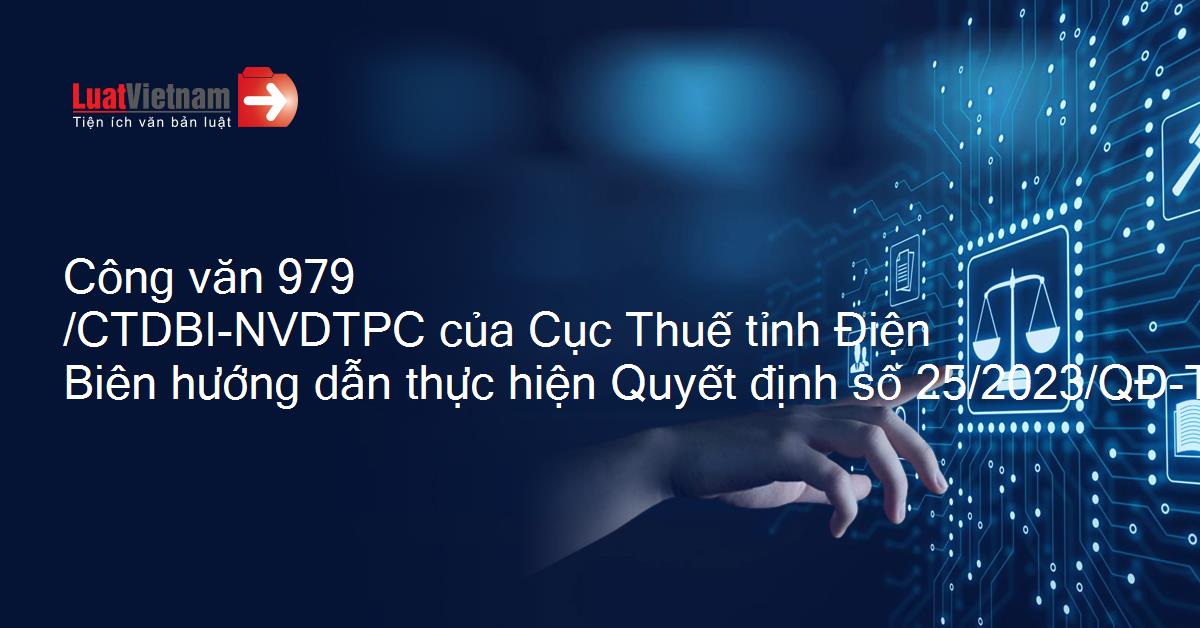 | TỔNG CỤC THUẾ CỤC THUẾ TỈNH ĐIỆN BIÊN ______________ Số: 979/CTDBI-NVDTPC V/v hướng dẫn thực hiện Quyết định số 25/2023/QĐ-TTg ngày 03/10/2023 của Thủ tướng Chính phủ về giảm tiền thuê đất của năm 2023 | CỘNG HÒA XÃ HỘI CHỦ NGHĨA VIỆT NAM Độc lập - Tự do - Hạnh phúc ___________________________ Điện Biên, ngày 23 tháng 10 năm 2023 |