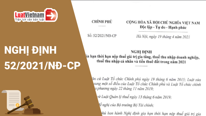 Ngày 19/4/2021, Chính phủ ban hành Nghị định 52/2021/NĐ-CP về việc gia hạn thời hạn nộp thuế giá trị gia tăng, thuế thu nhập doanh nghiệp, thuế thu nhập cá nhân và tiền thuê đất trong năm 2021.