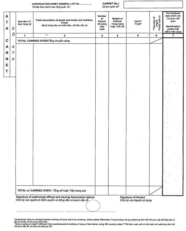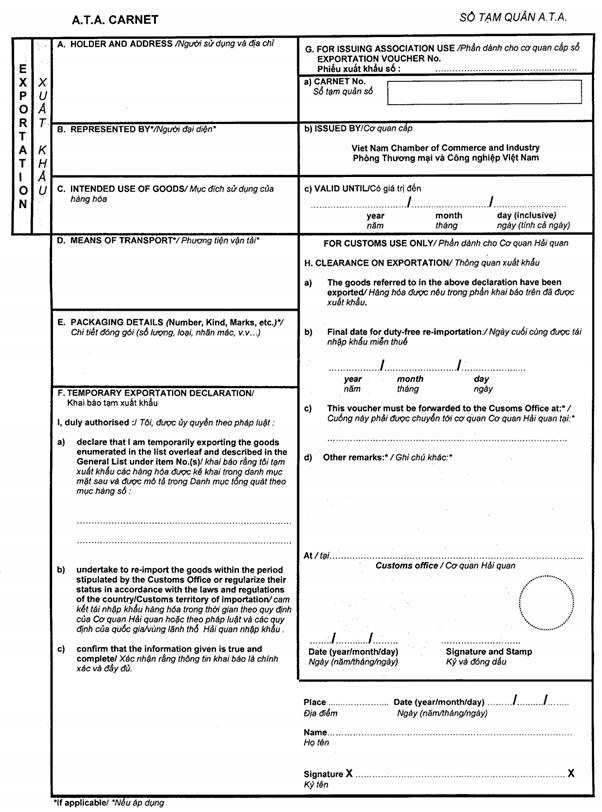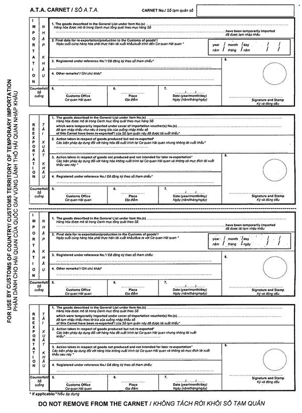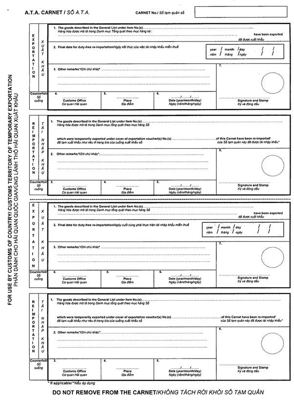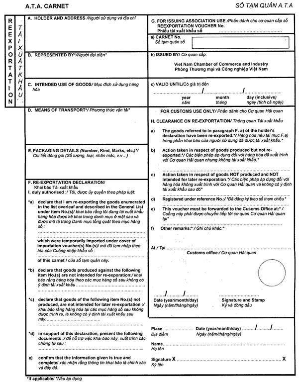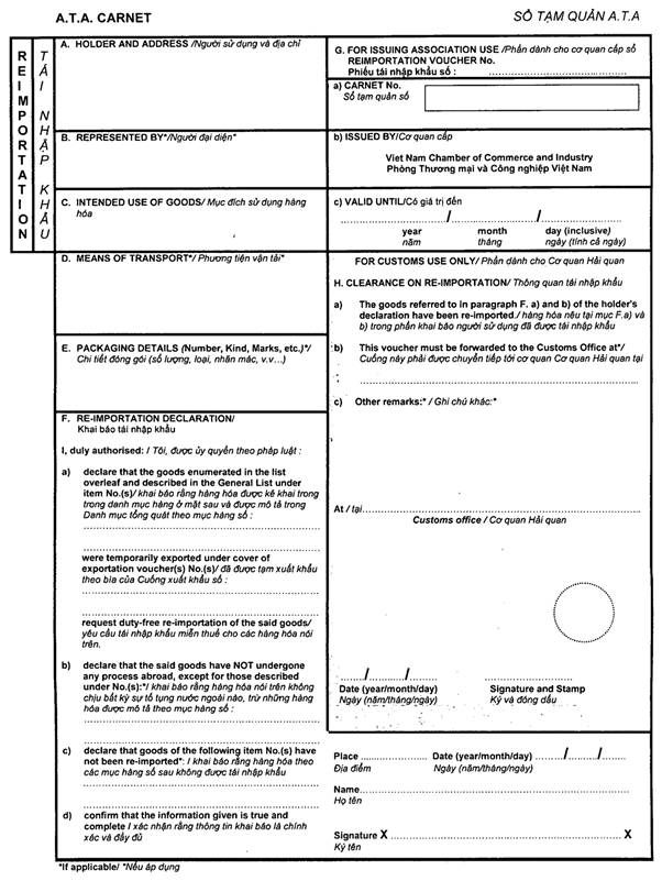 | Mục F | a) Khai báo rằng hàng hóa được kê khai trong danh mục hàng ở mặt sau và được mô tả trong Danh mục chung theo mục hàng số đã được tạm xuất khẩu theo bìa của Cuống xuất khẩu số.... | Ghi rõ các mục hàng đã tạm xuất (ví dụ: 1, 2...) đã được tạm xuất khẩu theo bìa của Cuống xuất khẩu số ... (điền số được Cơ quan cấp sổ ghi ở Mục G của Phiếu xuất khẩu màu vàng để xác nhận tạm xuất (Reimportation Voucher), thông thường là số 1 (tiếng Anh) | |