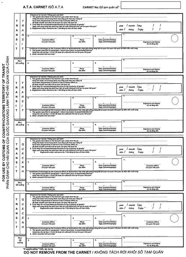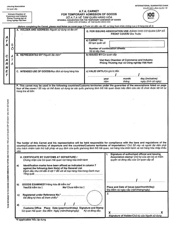 Bên cạnh đó, cơ quan cấp sổ ATA tại Việt Nam là Phòng Thương mại và Công nghiệp Việt Nam (VCCI). Hồ sơ đề nghị cấp sổ ATA gồm: