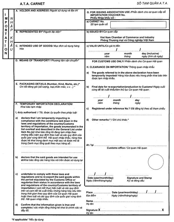 | Mục F | a) Khai báo rằng tôi đang tạm nhập theo các điều kiện quy định tại luật và các quy định của quốc gia/vùng lãnh thổ hải quan nhập khẩu, hàng hóa được kê khai trong danh mục hàng ở mặt sau và được mô tả trong Danh mục chung theo mục hàng số................... | Ghi rõ các mục hàng đề nghị tạm nhập (ví dụ: 1, 2...) | |