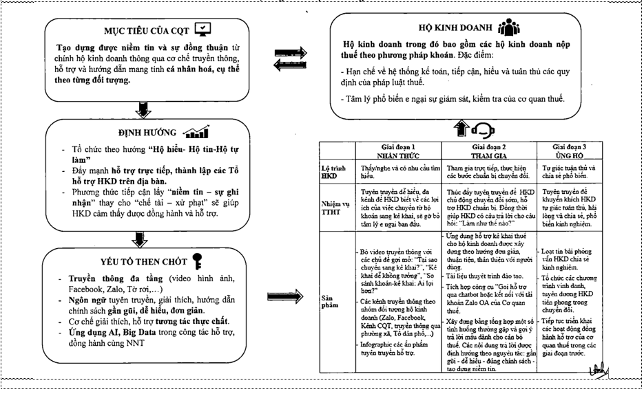 - Đảm bảo 100% hộ kinh doanh được tiếp cận thông tin và nhận được sự hỗ trợ từ cơ quan thuế về nội dung chuyển đổi từ phương thức thuế khoán sang phương thức kê khai, chuyển đổi từ hộ kinh doanh lên doanh nghiệp.