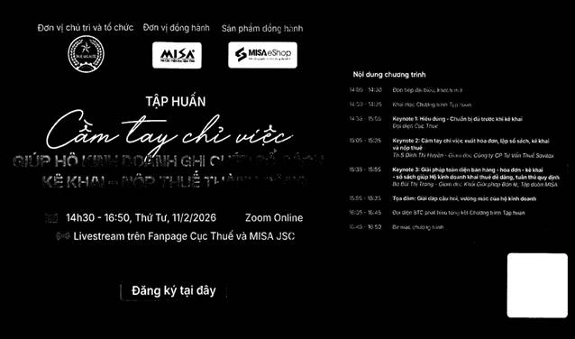 Nhằm tăng cường công tác hỗ trợ cho các hộ kinh doanh (HKD) tiếp cận, tìm hiểu thông tin về các chính sách, quy định pháp luật thuế, Cục Thuế và Công ty cổ phần Misa tổ chức Chương trình tập huấn “Cầm tay chỉ việc” hỗ trợ HKD ghi chép sổ sách, kê khai và nộp thuế. Để chương trình có sức lan tỏa rộng rãi, đạt hiệu quả cao, Cục Thuế đề nghị các Thuế tỉnh, thành phố thực hiện tuyên truyền, phổ biến tới các HKD trên địa bàn và chia sẻ thông tin liên quan tại các nền tảng mạng xã hội, fanpage, facebook của Thuế tỉnh, thành phố về thời gian, hình thức diễn ra chương trình để HKD biết, theo dõi và tham gia. Chương trình cụ thể như sau:
