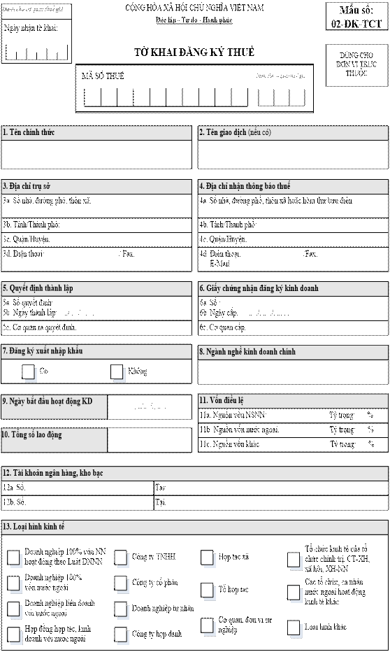 - Tờ khai đăng ký thuế theo mẫu số 02-ĐK-TCTvà các bảng kê kèm theo (nếu có). Trên tờ khai đăng ký thuế phải ghi rõ mã số thuế 13 số đã được đơn vị chủ quản thông báo.
