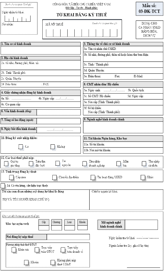 Mẫu số 03-ĐK-TCT: dùng cho các cá nhân, nhóm cá nhân sản xuất, kinh doanh hàng hoá và cung ứng dịch vụ.