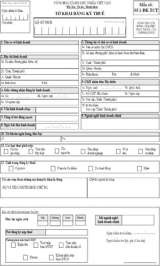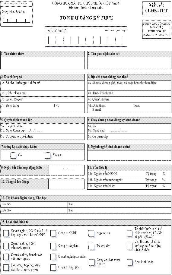 Mẫu số 01-ĐK-TCT: dùng cho các tổ chức sản xuất, kinh doanh hàng hoá và cung ứng dịch vụ, trừ các đơn vị trực thuộc.