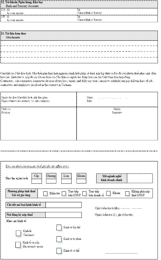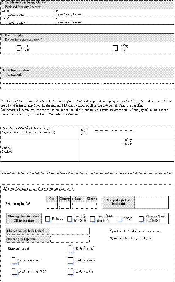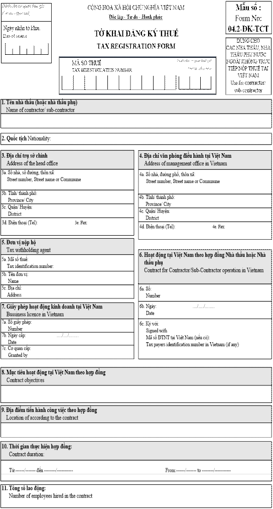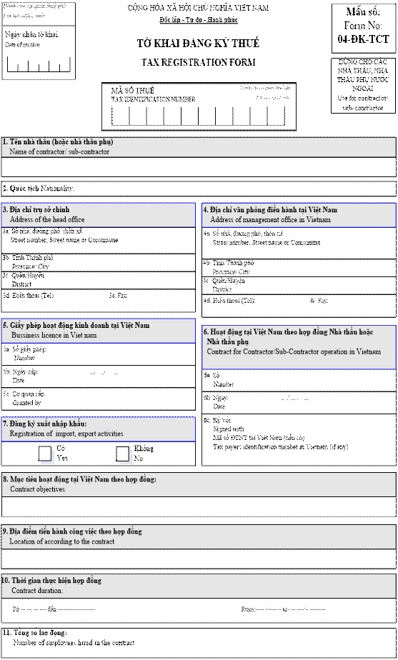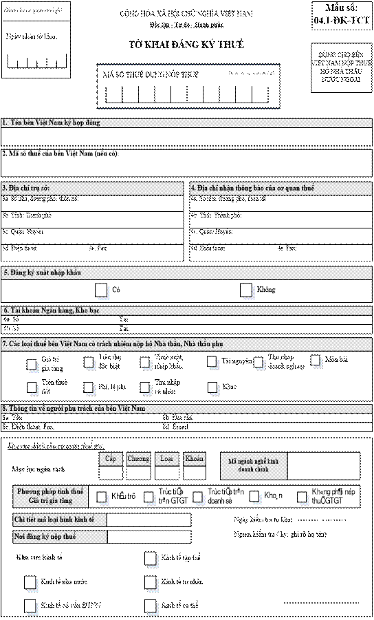 Mẫu số 04-ĐK-TCT: dùng cho các nhà thầu, nhà thầu phụ nước ngoài đăng ký nộp thuế trực tiếp với cơ quan Thuế Việt Nam.