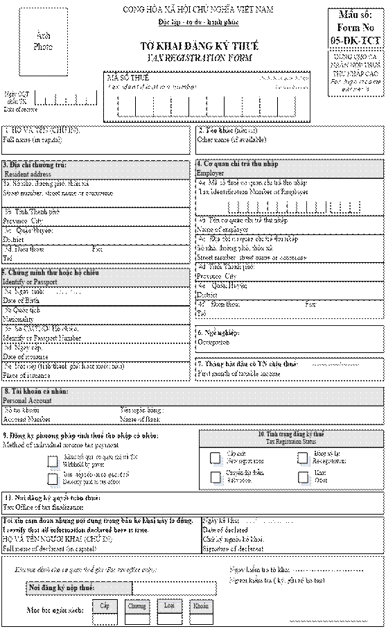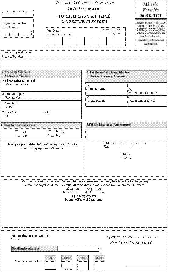 Mẫu số 06-ĐK-TCT: dùng cho các cơ quan đại diện ngoại giao và cơ quan đại diện của tổ chức quốc tế tại Việt Nam (theo mẫu quy định tại Thông tư số 08/2003/TT-BTC ngày 15/01/2003).