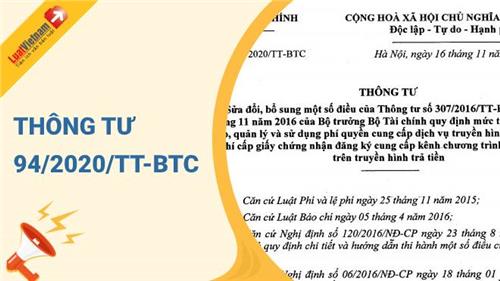 Ngày 16/11/2020, Bộ Tài chính ban hành Thông tư 94/2020/TT-BTC về việc sửa đổi, bổ sung một số điều của Thông tư 307/2016/TT-BTC ngày 15/11/2016 của Bộ trưởng Bộ Tài chính quy định mức thu, chế độ thu, nộp, quản lý và sử dụng phí quyền cung cấp dịch vụ truyền hình trả tiền và lệ phí cấp giấy chứng nhận đăng ký cung cấp kênh chương trình nước ngoài trên truyền hình trả tiền.