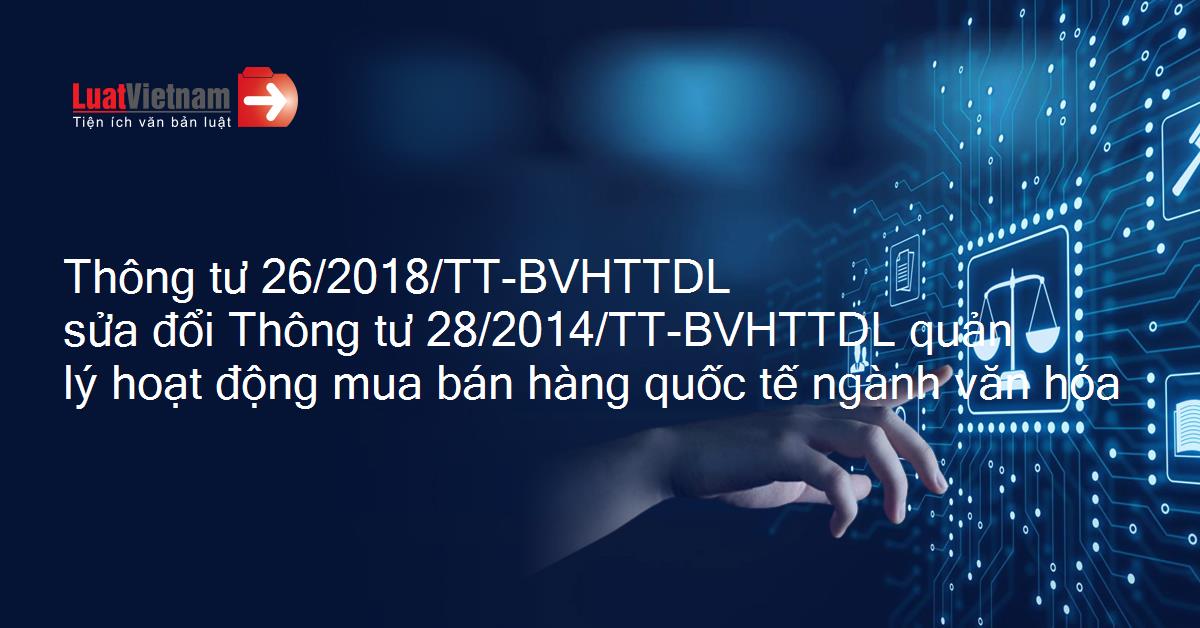 Ngày 11/09/2018, Bộ Văn hóa, Thể thao và Du lịch ban hành Thông tư 26/2018/TT-BVHTTDL sửa đổi, bổ sung một số Điều của TT 28/2014/TT-BVHTTDL ngày 31/12/2014 của Bộ trưởng Bộ Văn hóa, Thể thao và Du lịch quy định về quản lý hoạt động mua bán hàng hóa quốc tế thuộc diện quản lý chuyên ngành văn hóa của Bộ Văn hóa, Thể thao và Du lịch.