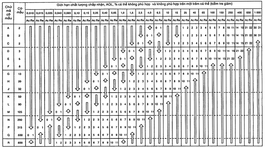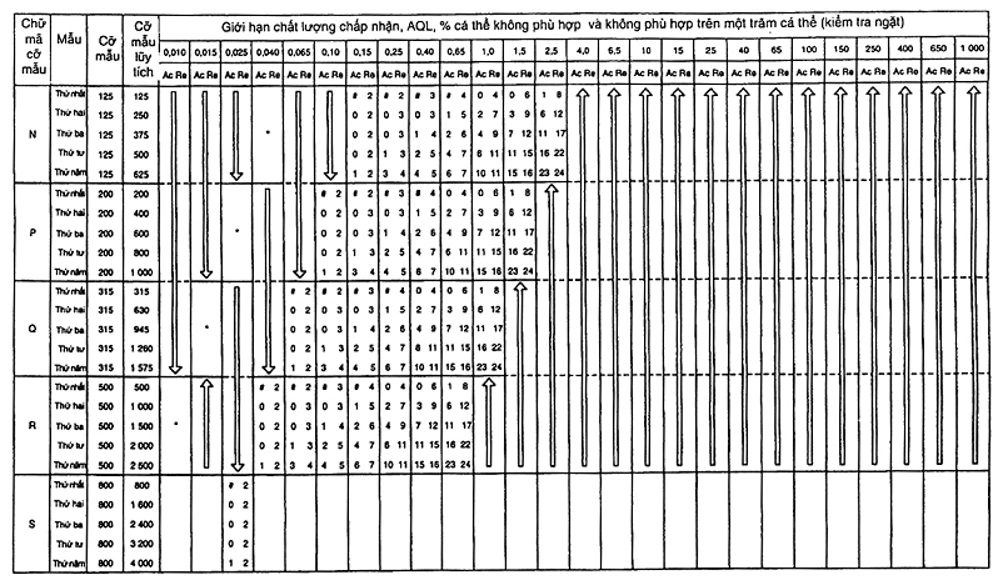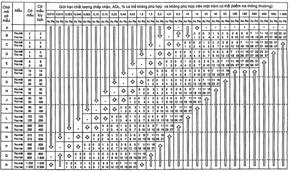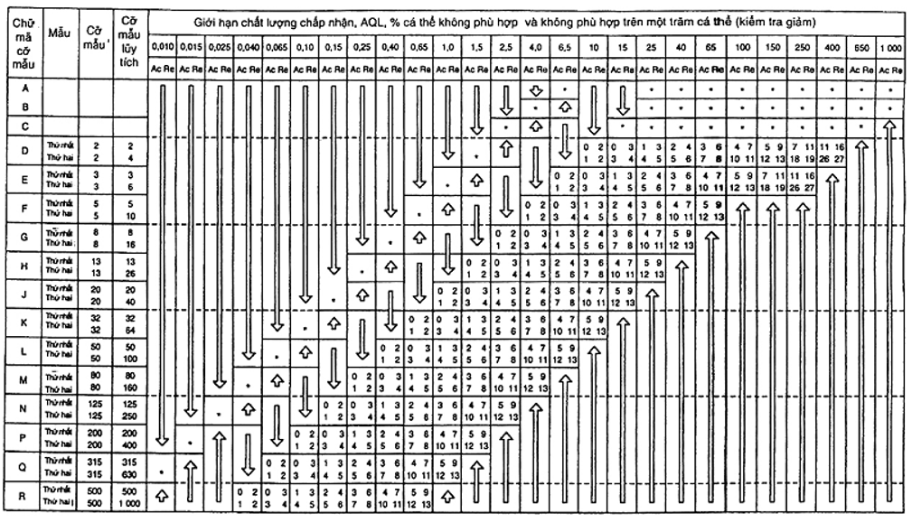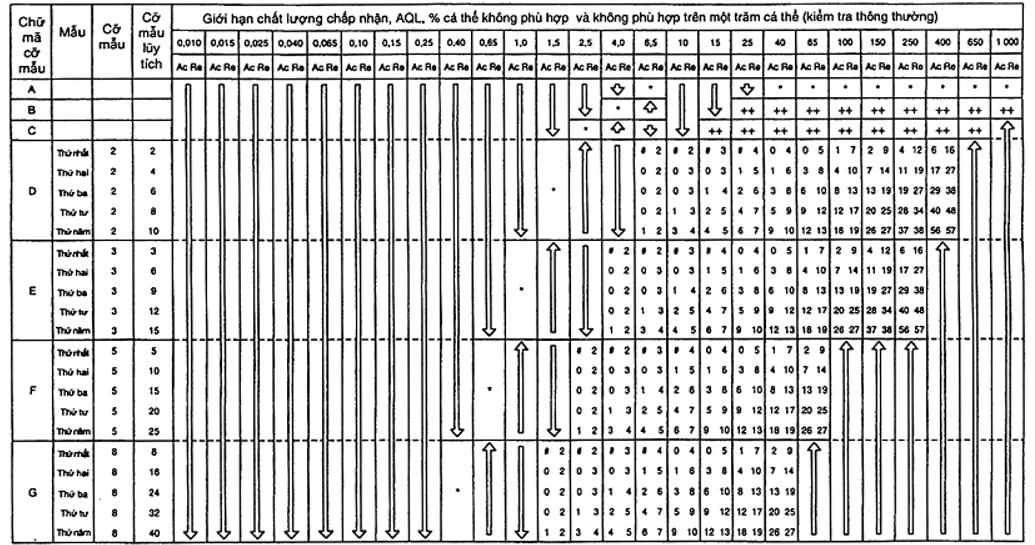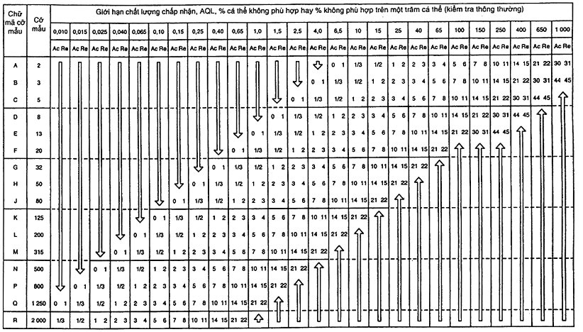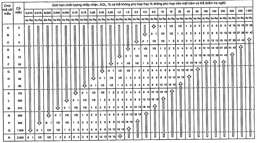 ò = Sử dụng phương án lấy mẫu đầu tiên bên dưới mũi tên. Nếu cỡ mẫu bằng hoặc vượt quá cỡ thì tiến hành kiểm tra 100%