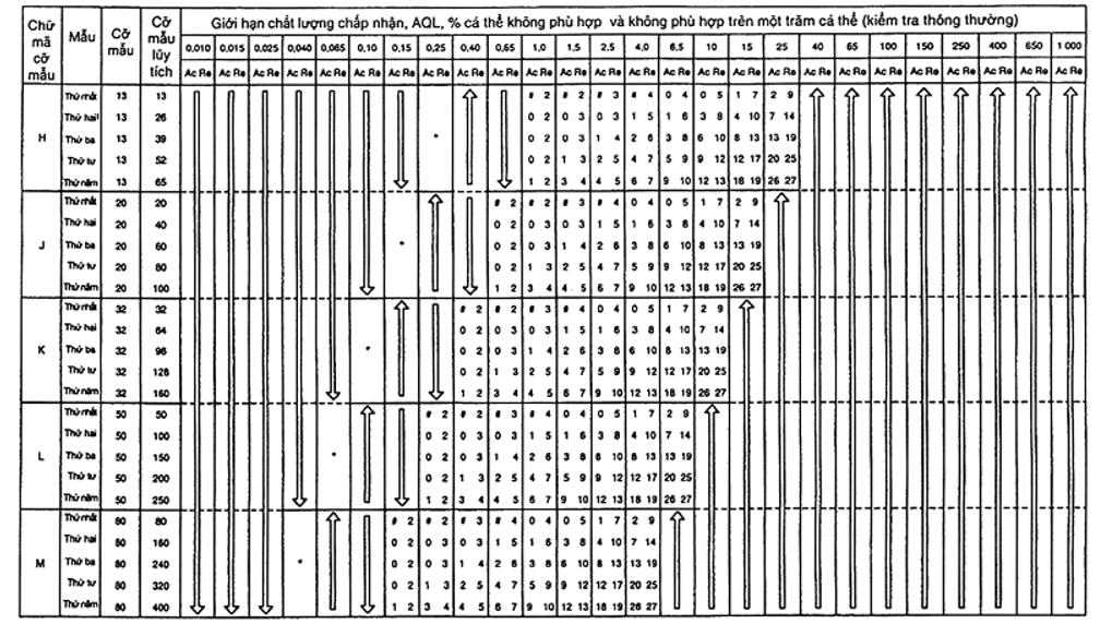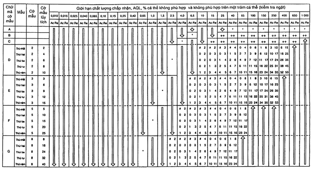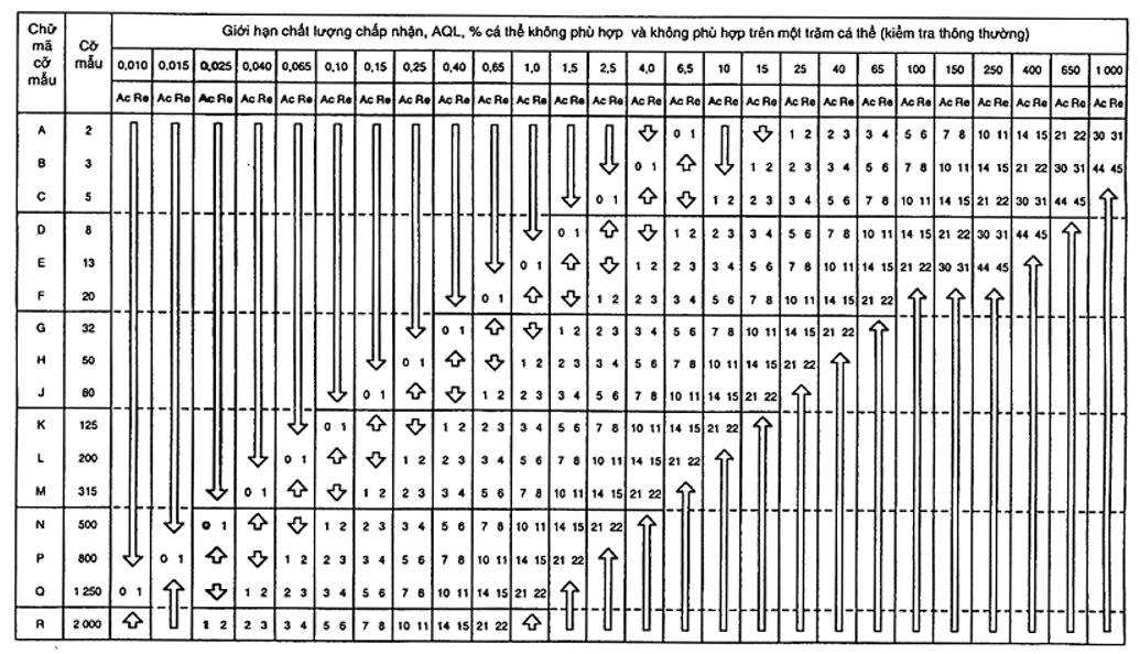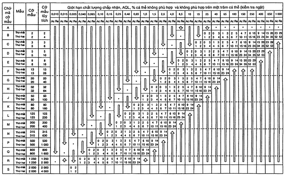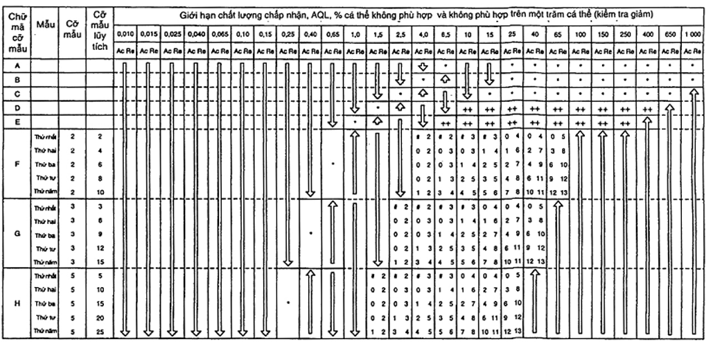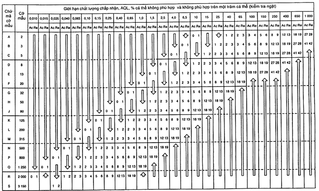 ò = Sử dụng phương án lấy mẫu đầu tiên bên dưới mũi tên. Nếu cỡ mẫu bằng hoặc vượt quá cỡ thì tiến hành kiểm tra 100%