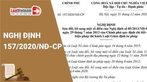 Ngày 31/12/2020, Chính phủ ban hành Nghị định 157/2020/NĐ-CP về việc sửa đổi, bổ sung một số điều của Nghị định 85/2013/NĐ-CP ngày 29/7/2013 của Chính phủ quy định chi tiết và biện pháp thi hành Luật Giám định tư pháp.