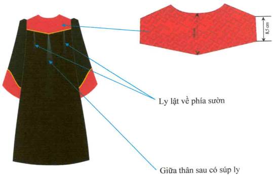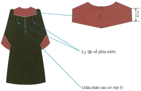 Nẹp áo hai bên hình cong có độ rộng 8 cm, nẹp áo ngoài rộng 8 cm, nẹp lót trong rộng 5 cm. Đầu tay hai bên có xếp 8 ly nhỏ, 4 ly lật về phía trước, 4 ly lật về phía sau.