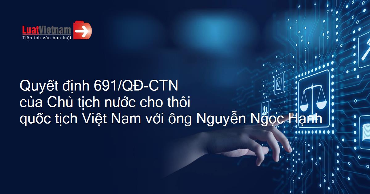Quyết định số 691/QĐ-CTN được ban hành bởi Chủ tịch nước Cộng hòa xã hội chủ nghĩa Việt Nam vào ngày 11 tháng 5 năm 2020. Văn bản này quy định việc cho thôi quốc tịch Việt Nam đối với ông Nguyễn Ngọc Hạnh, người sinh ngày 08/12/1996 tại Cộng hòa Lít-va và hiện đang cư trú tại địa chỉ Sausio 13 Osios 5-130 Vilnius, Cộng hòa Lít-va.