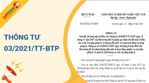 Ngày 25/05/2021, Bộ Tư pháp ban hành Thông tư 03/2021/TT-BTP về việc sửa đổi, bổ sung một số điều của Thông tư 08/2017/TT-BTP ngày 15/11/2017 của Bộ trưởng Bộ Tư pháp quy định chi tiết một số điều của Luật Trợ giúp pháp lý và hướng dẫn giấy tờ trong hoạt động trợ giúp pháp lý; Thông tư 12/2018/TT-BTP ngày 28/8/2018 của Bộ trưởng Bộ Tư pháp hướng dẫn một số hoạt động nghiệp vụ trợ giúp pháp lý và quản lý chất lượng vụ việc trợ giúp pháp lý.