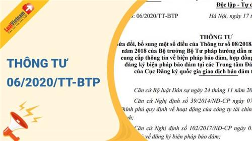 Ngày 17/2/2020, Bộ Tư pháp đã ban hành Thông tư 06/2020/TT-BTP sửa đổi, bổ sung Thông tư 08/2018/TT-BTP ngày 20/6/2018 hướng dẫn một số vấn đề về đăng ký, cung cấp thông tin về biện pháp bảo đảm, hợp đồng và trao đổi thông tin về đăng ký biện pháp bảo đảm tại các Trung tâm Đăng ký giao dịch, tài sản của Cục Đăng ký quốc gia giao dịch bảo đảm thuộc Bộ.