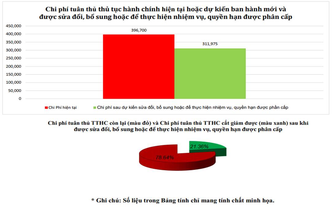 Lợi ích từ việc sửa đổi, bổ sung hoặc để thực hiện nhiệm vụ, quyền hạn được phân cấp được tính bằng chi phí tuân thủ thủ tục hành chính hiện tại trừ đi chi phí tuân thủ thủ tục hành chính được sửa đổi, bổ sung hoặc để thực hiện nhiệm vụ, quyền hạn được phân cấp. Phần mềm Excel tại Phần III - So sánh chi phí sẽ tự động tính và thể hiện thông qua các biểu đồ so sánh kèm theo các giá trị và tỷ lệ % sửa đổi, bổ sung hoặc để thực hiện nhiệm vụ, quyền hạn được phân cấp./.
