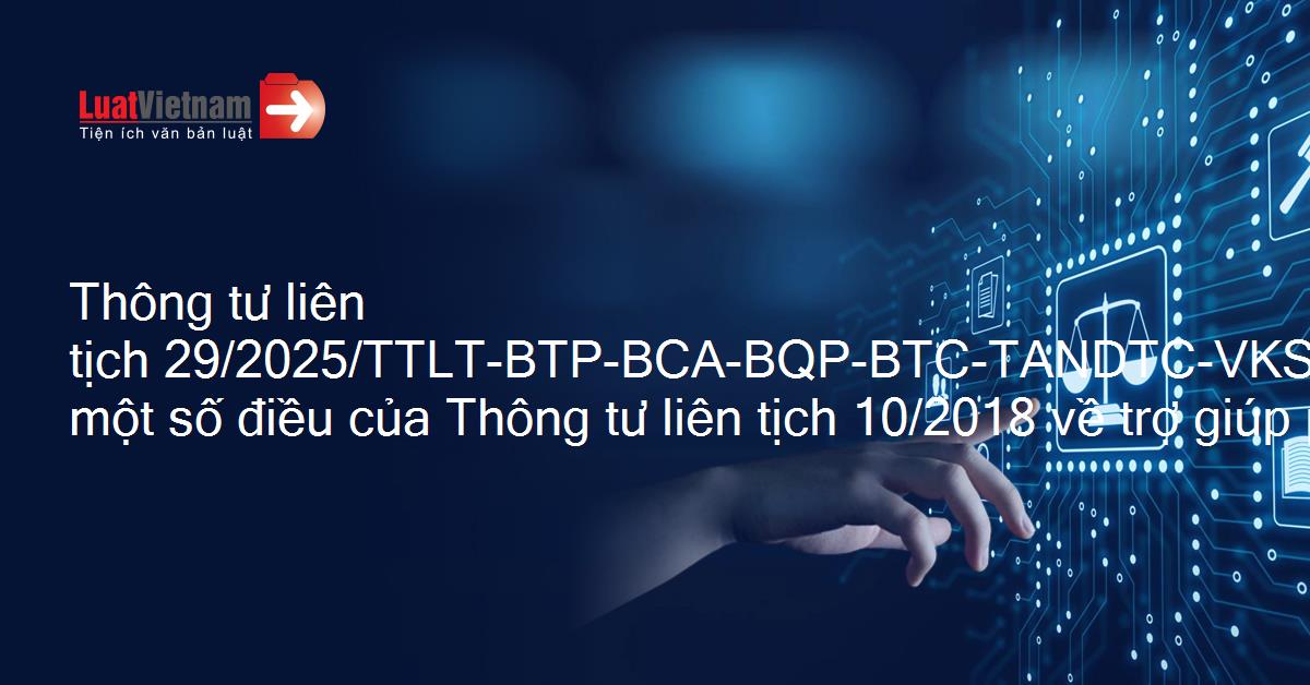 Ngày 31/12/2025, Bộ Công an, Bộ Quốc phòng, Bộ Tư pháp, Bộ Tài chính, Tòa án nhân dân tối cao, và Viện kiểm sát nhân dân tối cao đã ban hành Thông tư liên tịch số 29/2025/TTLT-BTP-BCA-BQP-BTC-TANDTC-VKSNDTC. Thông tư này sửa đổi, bổ sung một số điều của Thông tư liên tịch số 10/2018/TTLT-BTP-BCA-BQP-BTC-TANDTC-VKSNDTC, quy định về phối hợp thực hiện trợ giúp pháp lý trong hoạt động tố tụng.