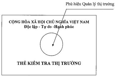 Mặt trước nền màu đỏ, chữ màu vàng, có đường viền màu vàng bao quanh; trên cùng là Quốc hiệu “CỘNG HÒA XÃ HỘI CHỦ NGHĨA VIỆT NAM, Độc lập - Tự do - Hạnh phúc”; ở giữa là phù hiệu Quản lý thị trường; phía dưới là dòng chữ “THẺ KIỂM TRA THỊ TRƯỜNG”.