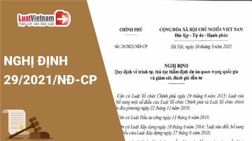 Ngày 26/3/2021, Chính phủ đã ban hành Nghị định 29/2021/NĐ-CP quy định về trình tự, thủ tục thẩm định dự án quan trọng quốc gia và giám sát, đánh giá đầu tư.