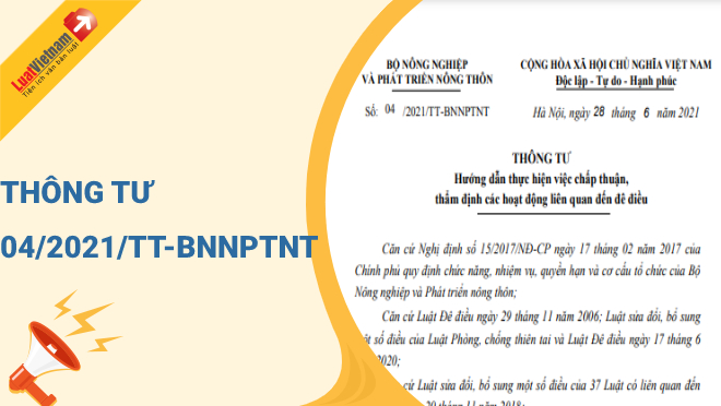 Ngày 28/6/2021, Bộ Nông nghiệp và Phát triển nông thôn ban hành Thông tư 04/2021/TT-BNNPTNT về việc hướng dẫn thực hiện việc chấp thuận, thẩm định các hoạt động liên quan đến đê điều.