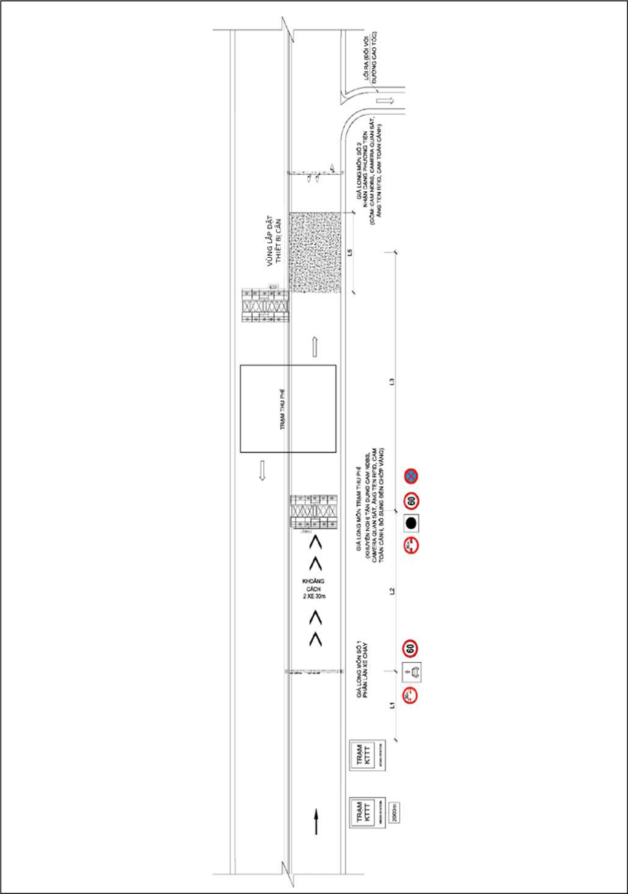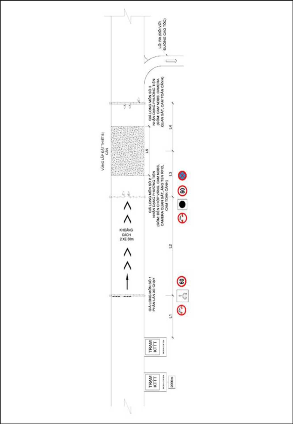2.5.7.2. Giá long môn số 2: đặt cách điểm đầu vùng lắp đặt thiết bị cân tối thiểu 15 m, trên giá có gắn các biển báo hiệu về cự ly tối thiểu giữa các xe, tốc độ tối đa, tốc độ tối thiểu cho phép xe đi qua vùng cân, biển báo cấm dừng xe, cấm đỗ xe và đèn chớp vàng, camera đọc biển số sau của xe, camera giám sát làn và đèn chiếu sáng;
