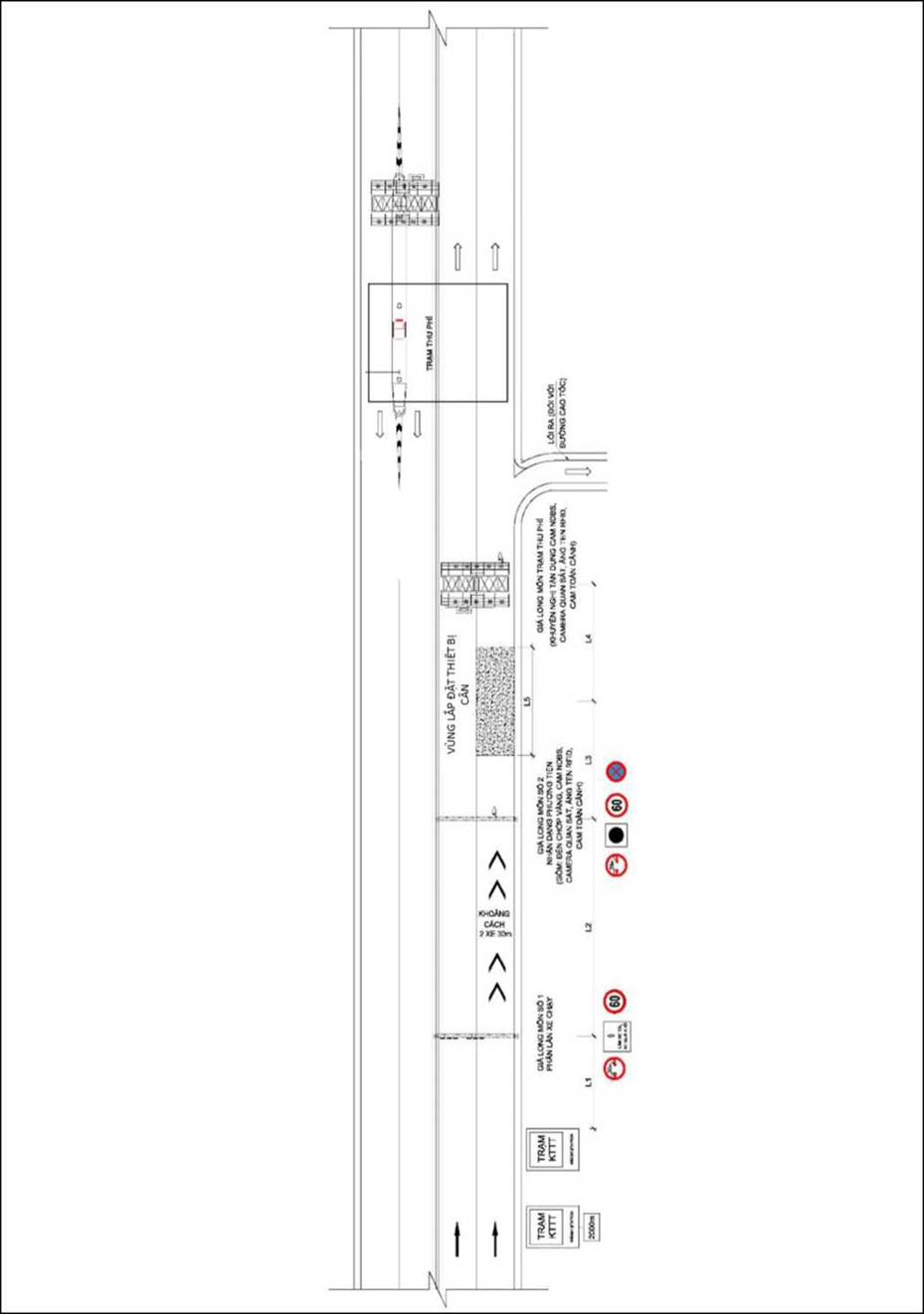 2.5.7.1. Giá long môn số 1: đặt trước và cách giá long môn số 2 tối thiểu 50 m, trên giá long môn có gắn các biển báo phân làn đường, loại xe, cự ly tối thiểu giữa các xe, biển báo cấm dừng xe, cấm đỗ xe, tốc độ tối đa, tốc độ tối thiểu cho phép xe đi qua vùng cân;
