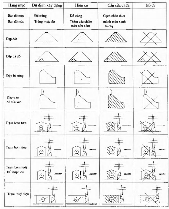 17.1. Các công trình và hạng mục công trình trong bản vẽ thủy lợi cần tuân theo các ký hiệu quy ước được trình bày trong Phụ lục B, cụ thể như sau: