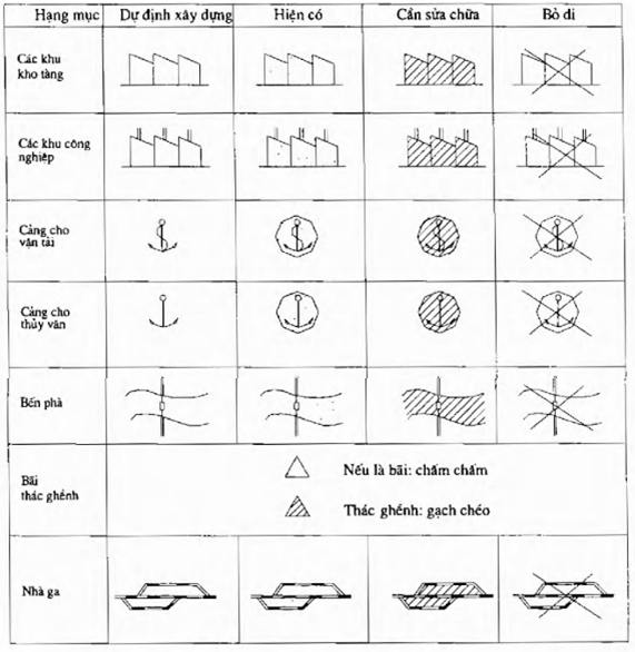 Các ký hiệu này đều được lập theo các tình trạng: dự định xây dựng, hiện có, cần sửa chữa hoặc cần dỡ bỏ.