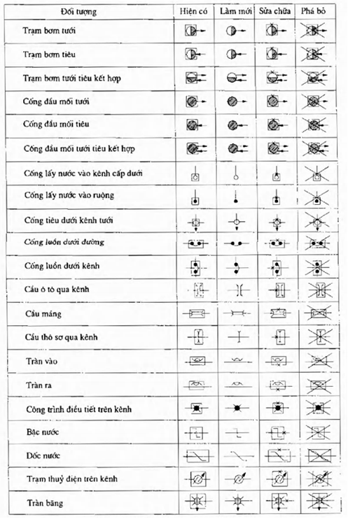 Bao gồm các ký hiệu công trình trên các bản đồ hệ thống tưới, tiêu, các bản vẽ mặt bằng hoặc sơ họa tuyến kênh như: trạm bơm tưới, tiêu, cống đầu mối tưới, tiêu, cống lấy nước, cầu ô tô, cầu máng… (xem Hình B.2).