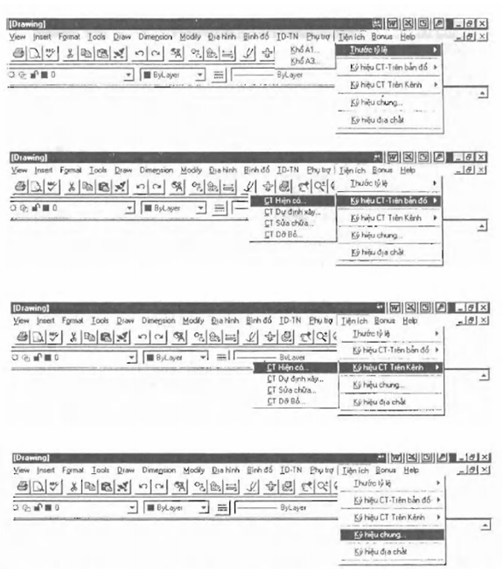 Khi sử dụng AutoCAD, các ký hiệu trên đã được lập sẵn trong menu TIỆNÍCH, chi tiết được trình bày trong Phụ lục C – Hướng dẫn sử dụng menu TIỆNÍCH.