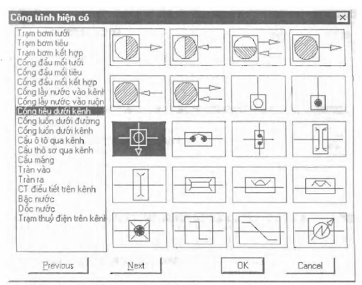 2. Để chọn được hạng mục mong muốn, ví dụ như ký hiệu một cống tiêu dưới kênh hiện có cách làm như sau: