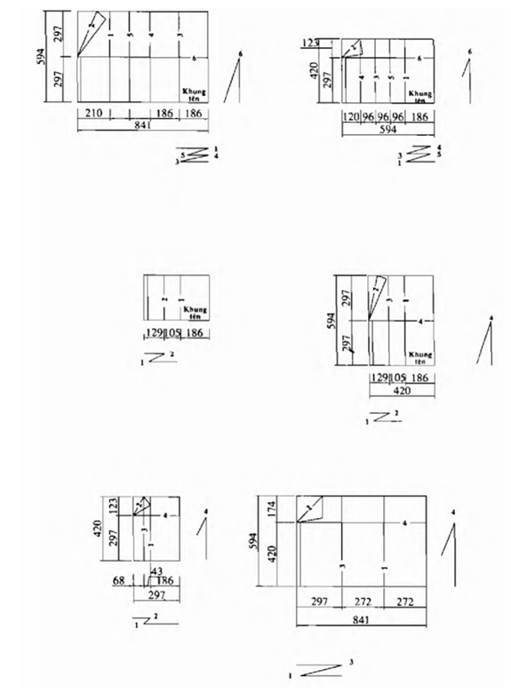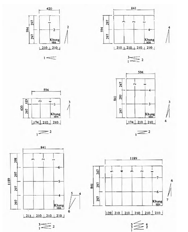 Cách gấp bản vẽ được trình bày qua các hình vẽ cụ thể trong Phụ lục E, trong đó các số nguyên chỉ số thứ tự thực hiện đường gấp. Ví dụ, đầu tiên gấp theo đường 1, sau đó gấp theo đường 2, tiếp đến gấp theo đường 3, đường 4 và tiếp tục cho đến đường cuối cùng. Cách gấp này đảm bảo trang có khung tên luôn ở mặt ngoài, tiện ích cho nhận biết tên, số hiệu bản vẽ.