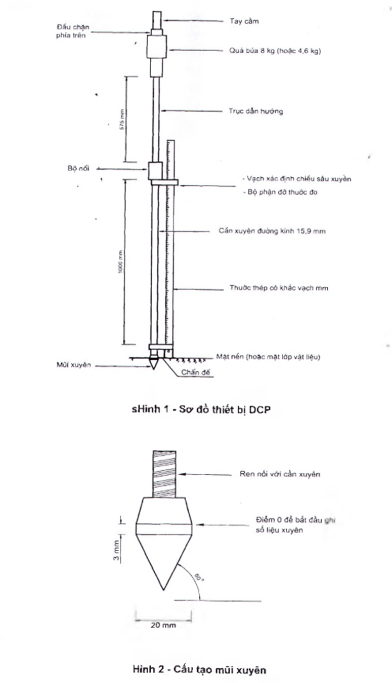 1.3 Phương pháp này thích hợp với chiều sâu xuyên DCP đến 900 mm. Trường hợp chiều sâu xuyên DCP lớn hơn 900 mm, có thể sử dụng cần xuyên nối dài. Tuy nhiên, do lực ma sát bề mặt dọc theo cần xuyên khi nối dài sẽ tăng lên nên việc sử dụng quan hệ độ xuyên-CBR đã xác lập trong tiêu chuẩn này sẽ có những sai số nhất định.