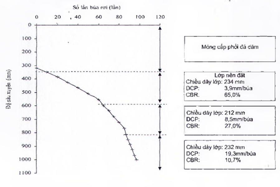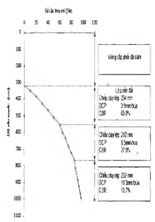 - Trên cơ sở kết quả thử nghiệm DCP, thiết lập đồ thị quan hệ giữa số lần búa rơi tích luỹ - chiều sâu xuyên (ví dụ tại Hình 5 với số liệu tại Bảng 1).