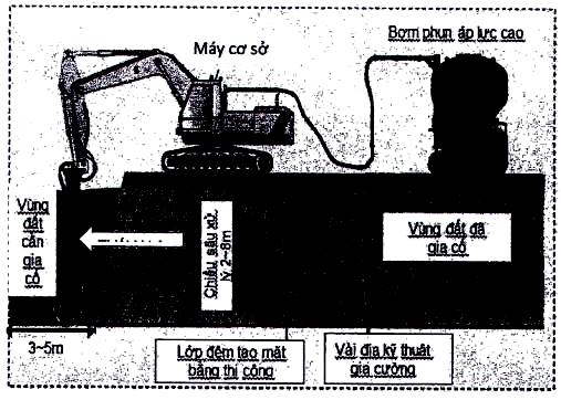 4.2. Các yếu tố thực tế trên hiện trường thi công đều ảnh hưởng tới chất lượng gia cố. Do vậy, việc thi công thử tại công trình, tìm hiệu quả gia cố tối ưu là bắt buộc. Phạm vi gia cố thử do tư vấn thiết kế quyết định, nhưng không ít hơn một ô 5mx5m, gia cố hết chiều sâu thiết kế.