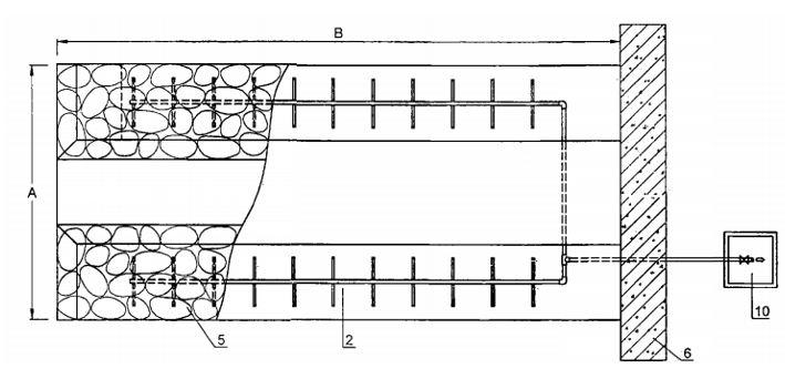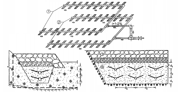 • Trường hợp nước thấm từ trên mặt xuống tầng cát thì các ống thổi rửa bố trí nằm trên lớp cát và dưới lớp dăm sỏi. Khi hoạt động, dòng khí (hoặc nước) hướng ngược lên trên;