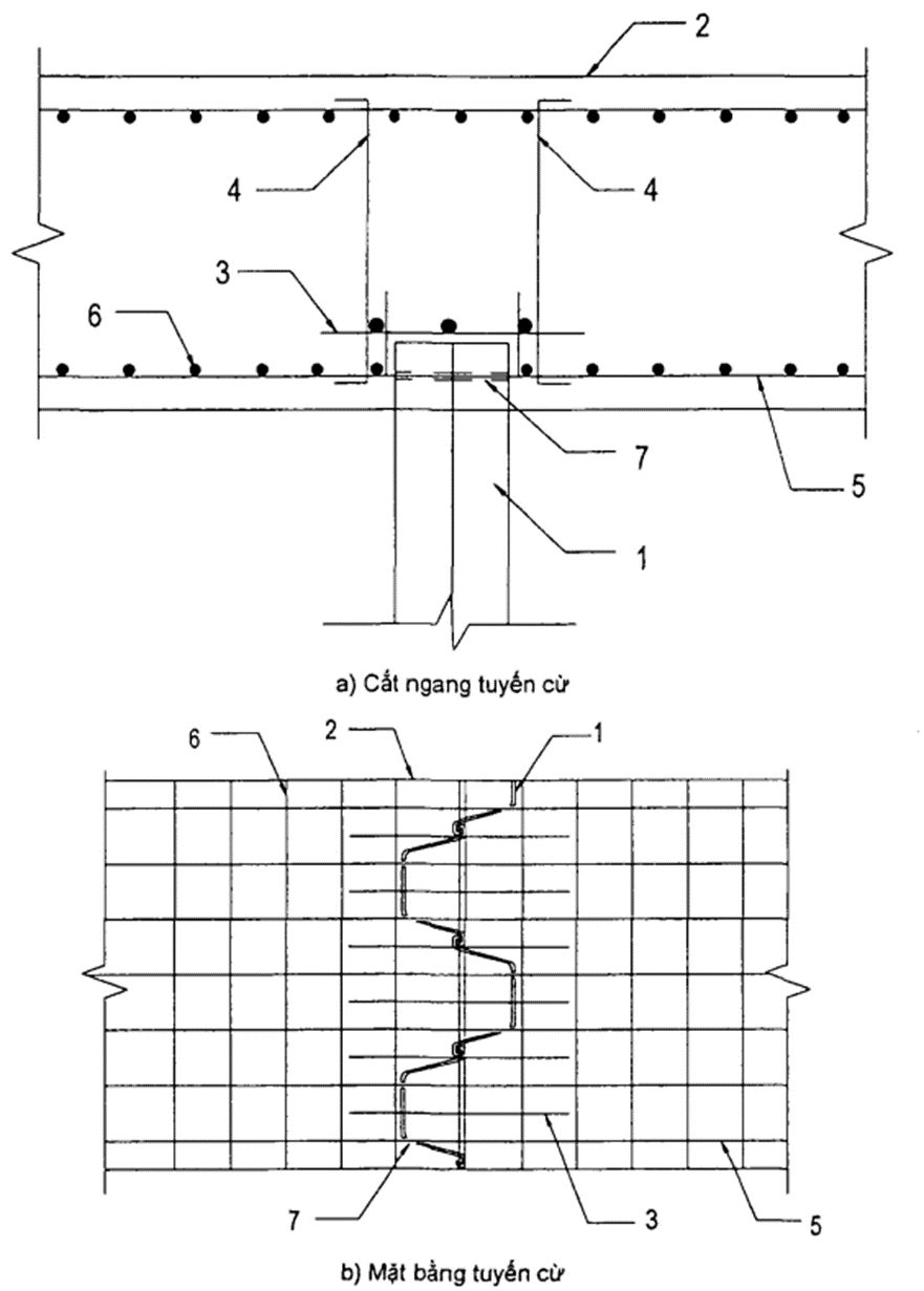 5.1.2.1 Tuyến cừ chống thấm phải đảm bảo liên tục, liên kết được với kết cấu bản đáy công trình và với kết cấu nối tiếp hai bên mang công trình. Chi tiết nối tiếp giữa tuyến cừ mang với công trình xem Hình 2.